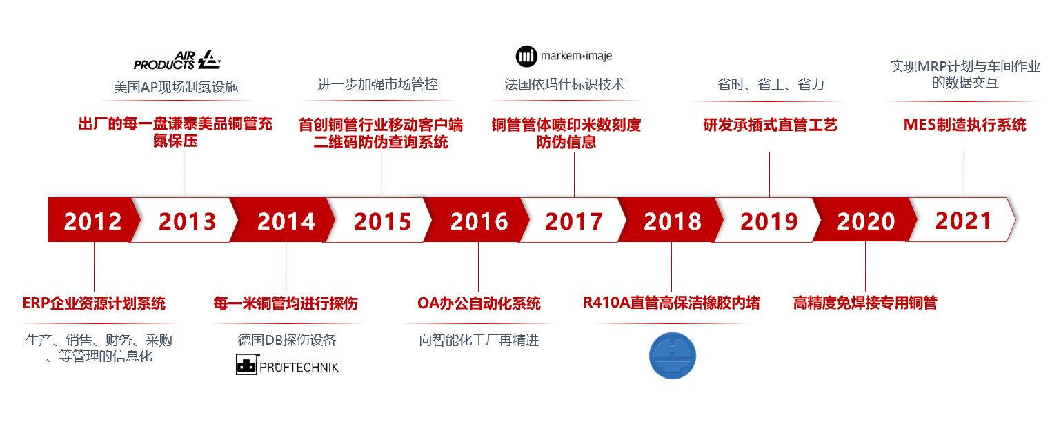 始建于1993年9月的青島宏泰銅業有限公司,座落于山東省青島市平度同和工業園同和路97號,從1993年開始一直專注于紫銅管系列產品的研發和生產,是高精度高清潔R410A銅管、給排水銅管、內螺紋銅管、蚊香型盤管、醫療氣體用銅管、地暖管、外徑54毫米以上大口徑銅直管、暖氣片銅管、保溫銅管、覆塑銅水管、毛細銅管等紫銅管的生產專家與領跑者。宏泰銅管被廣泛應用于空調主機、中央空調或多聯機空調、冰箱、冰柜、太陽能、散熱器、導電、健康飲用水、地暖安裝工程、醫療器械廠和造船廠等。宏泰公司的銅管產銷量在山東省同行業中遙遙領先,其中宏泰“ logo-防偽 ”牌R410A冷媒專用銅管是全國制冷市場認知的高端品牌。